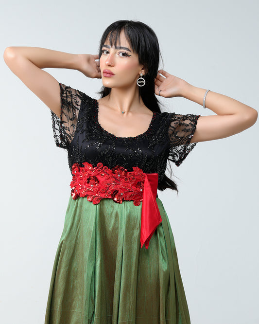 Indian silk and soft tulle dress embellished with sequins and a stone-studded belt