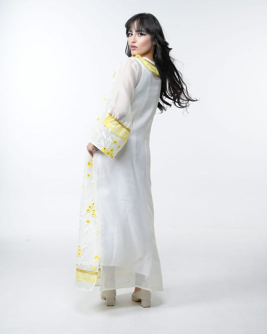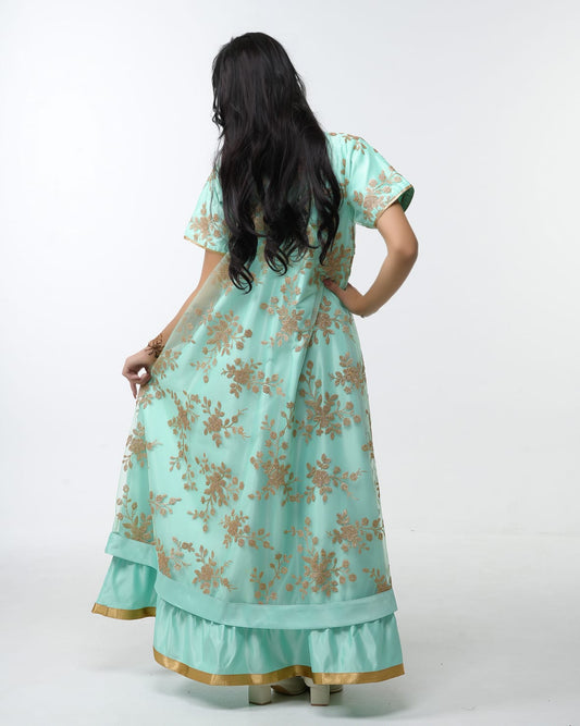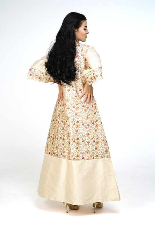 Luxurious Satin dress with Tulle embroidered using golden threads and studded with crystals