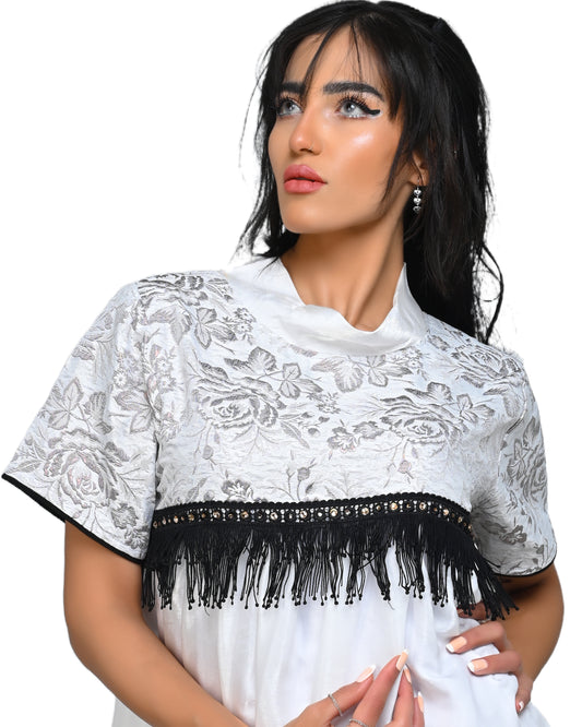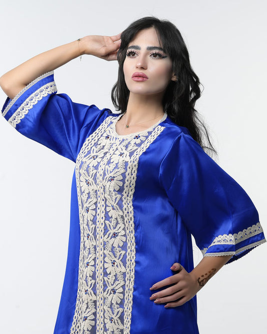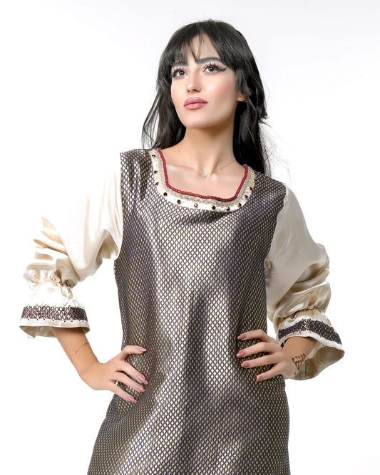 Luxurious Satin dress with Tulle embroidered using golden threads and studded with crystals