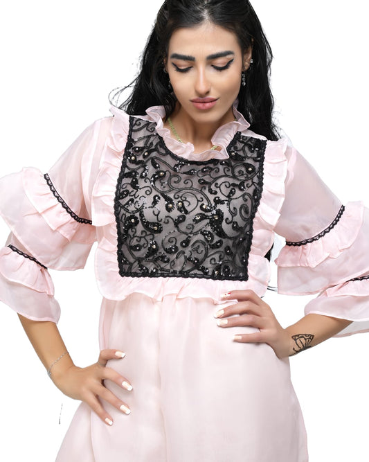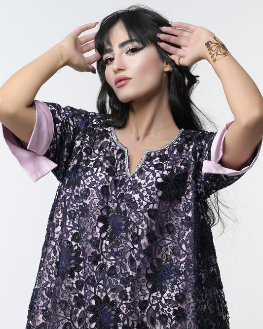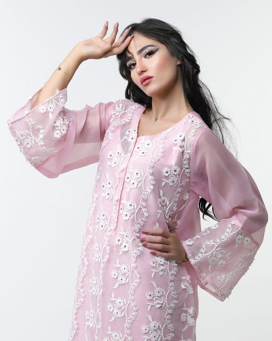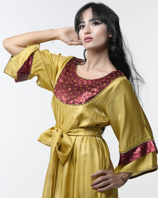Indian silk and soft tulle dress embellished with sequins and a stone-studded belt